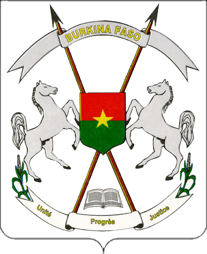 • un (1) écu portant au chef, sur une banderole d’argent le nom du Pays: « BURKINA FASO  » ;