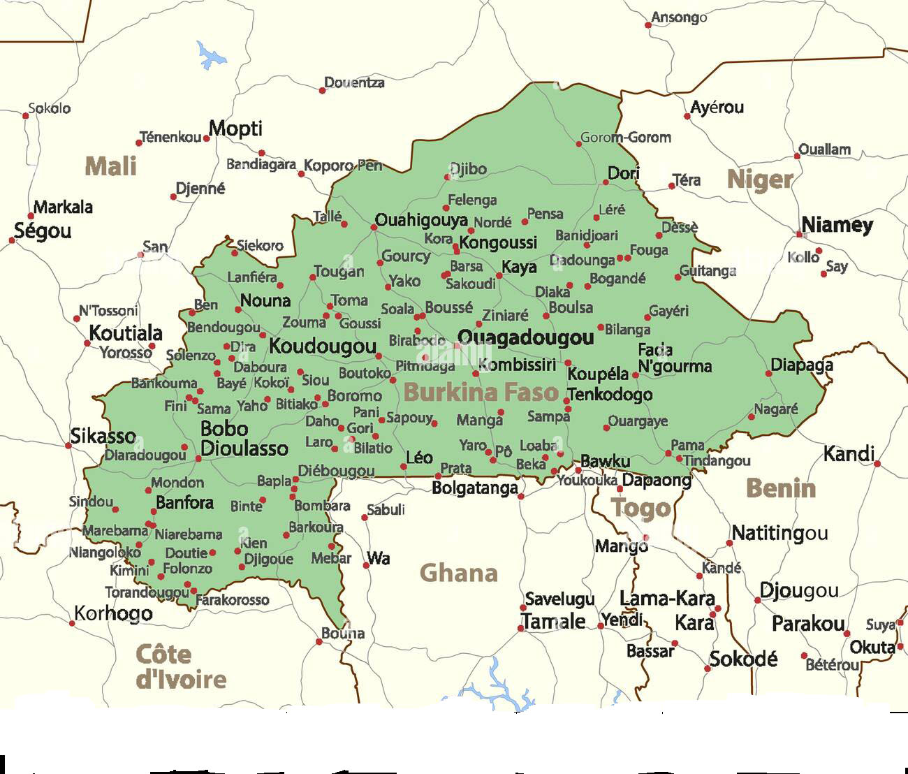 Le Burkina Faso, littéralement « Pays des hommes intègres » est un pays d’Afrique de l’Ouest. Il est entouré par : le Mali au Nord et à l’Ouest, le Niger au Nord-Est, le Bénin au Sud-Est, le Togo et le Ghana au sud et la Côte d’Ivoire au Sud-Ouest. Il n’a donc pas de débouché sur la mer. C’est un pays très plat, puisque le point culminant est le Tenakourou à 747 m à l’ouest.